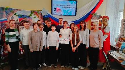 Библиотекари предложили школьникам отправиться в «путешествие» по России. Вниманию присутствующих была предложена выставка-экспозиция «В единстве народов – сила России», на которой были представлены как книги, так и экспонаты, отражающие многонациональную палитру народов нашей великой страны. Особенно заинтересовали ребят книги «Крым. Процветание в единстве» и фотоальбом «Народы Крыма». Вместе с ведущими юные читатели во время дискуссии «Мы разные – мы вместе» обсудили, как сохранить культурное наследие в современном мире, поговорили о толерантности и межкультурном общении в молодежной среде. Активно и оживленно прошла интеллектуальная игра-викторина «Культурная мозаика», которая состояла из нескольких раундов: «История» – где были вопросы о главных событиях, объединивших народы России; «Традиции» – учащиеся отвечали на вопросы о праздниках, обычаях, национальных костюмах и блюдах; «Искусство» – задания на определение вида народного творчества по изображениям. В поисках ответа, ребята иногда спорили, с азартом искали подсказки на книжных полках и выставке, равнодушных не было! Далее гостям библионочи был предложен к просмотру видеоролик «Год единства народов России», с обсуждением вопроса: «Какие ценности являются общими для всех народов нашей страны». Разговор получился глубоким, эмоциональным и познавательным. Финалом вечера стало общее фото участников у тематической фотозоны с баннером «Россия сильна, когда едина».